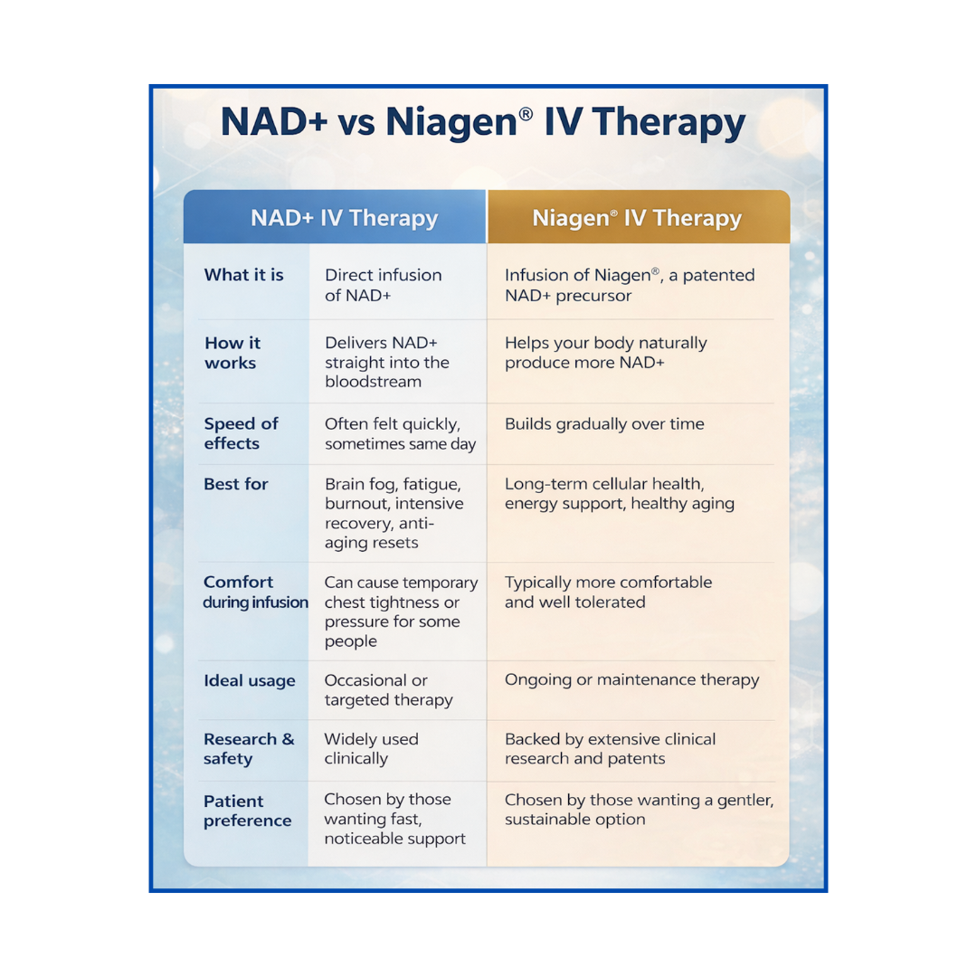 Ultimately, the choice between Niagen and NAD+ comes down to goals and lifestyle. Some people want the fast, noticeable impact of NAD+ infusions, while others prefer the steady, research-backed approach of Niagen.